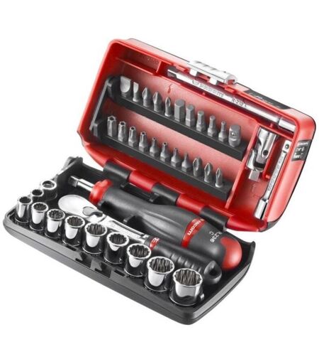 Gamme Facom 1/4' - Eléments d'entraînement, embouts série 1, clé à douille hexagonale, clé à cliquet réversible, boîte ultra compacte, 38 pièces.