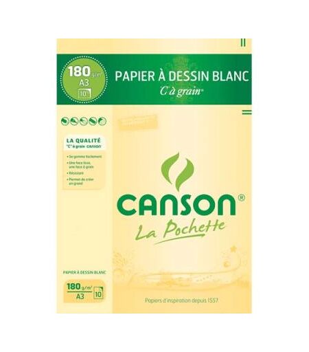 Feuilles de papier dessin C à grain Canson coloris blanc. Grammage 180g. Format A3. Ref fabricant 27106. Pochette de 10 . Pour le crayon l'encre la gouache et le feutre. Innovant : Pochette DUO intégrant un compartiment de rangement pour les feuilles vierges et un autre pour les feuilles usagées. ...