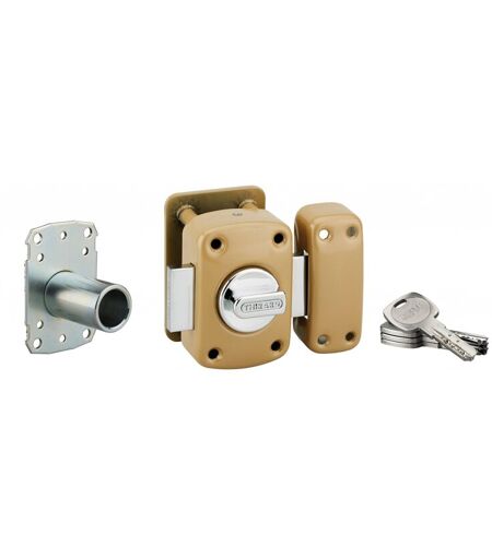 Ce verrou de haute sûreté en acier embouti est le système de fermeture le plus efficace pour verrouiller vos portes. Il peut être ajouté à une porte déjà équipée pour doubler la sécurité contre les effractions. Quatre clés plates en laiton sont fournies avec ce verrou, pour pouvoir partager l'accès ou pour conserver en cas de perte. Protégé par une plaque de blindage et un cabochon de cylindre, ce verrou breveté Thirard s'installe facilement et offre un verrouillage hautement sécurisé de votre porte. Il est également reconnu par les companies d'assurance. Ce verrou de porte à bouton Thirard possède un cylindre de 45mm. ...
