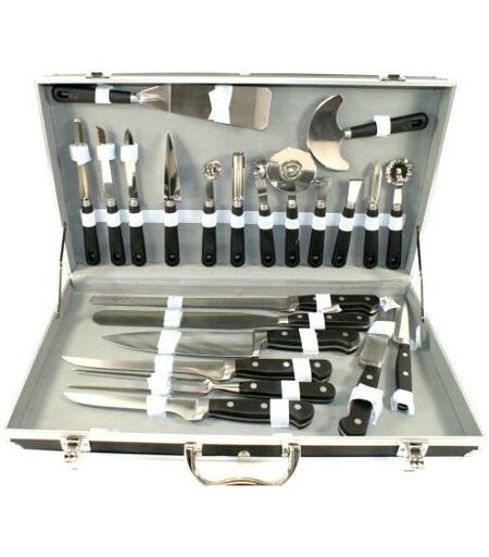 Très belle valise de couteaux pour commencer en cuisine ! 22 couteaux et accessoires - Excellent rapport qualité/prix ! Lames en acier inoxydable alimentaire Manches 3 rivets avec lame pleine soie : solides et ergonomiques Idéale pour les apprentis en cuisine ! Dimensions : 50 x 28 x 7 cm - Robuste, facile à transporter Voir composition ci-dessous ...