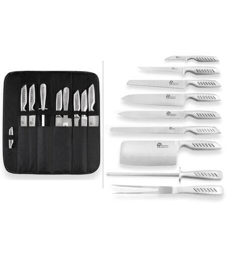 Mallette idéale pour réaliser toutes vos recettes Lames en acier inoxydable avec le logo de la marque Manches acier inoxydable au design épuré Sac en toile renforcée pour le rangement 8 compartiments avec élastiques de maintient Voir composition complète ci-dessous ...