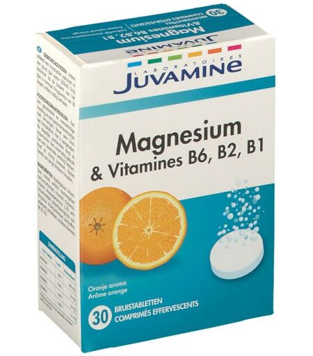 Complément alimentaire à utiliser dans le cadre d’une alimentation variée, équilibrée et d’un mode de vie sain.Chaque jour, l’organisme a besoin de vitamines et minéraux afin de bien fonctionner et d’être en pleine forme. Magnésium & Vitamines B6, B2, B1 garantit chaque jour 100% des besoins quotidiens en Vitamines B6, B2 et B1 ainsi qu’un apport spécifique.Magnésium & Vitamines B6, B2, B1 Le Magnésium est naturellement présent dans les cellules. Il participe à la transmission de l’influx nerveux et à un fonctionnement neuromusculaire normal. Il contribue à réduire la fatigue. Les Vitamines B6, B2 et B1 contribuent au bon fonctionnement du système nerveux.Composition:Acidifiant : acide citrique ; agent de charge : sorbitol ; poudre à lever : carbonate de sodium ; minéral : oxyde de magnésium ; arôme orange (2,2%) ; agent de charge : polyéthylène glycol ; acidifiant : phosphate de calcium ; édulcorant : aspartame, acésulfame de potassium, sucralose ; vitamines : B6, B1, B2.Valeur nutritionnelle: Pour 1 comprimé *AJR Magnésium 300 mg 80 % Vitamine B6 1,4 mg 100 % Riboflavine (B2) 1,4 mg 100 % Thiamine (B1) 1,1 mg 100 % (*) Apports de référence pour un adulte type (8400kJ/2000kCal)Conseils d'utilisation:Chaque matin, dissoudre 1 comprimé effervescent dans un verre d’eau de 200 ml environ. Ne pas prendre à jeun. Programme de 30 jours à renouveler si nécessaire.Précautions d'emploi:Tenir hors de portée des enfants. Il est recommandé de respecter la dose journalière conseillée. Une consommation excessive peut avoir des effets laxatifs. Conserver dans un endroit frais et sec. Contient une source de phénylalanine.Poids net: 30 comprimés effervescentsFabricant: Laboratoires Juva Santé 8, rue Christophe Colomb75008 Paris ...