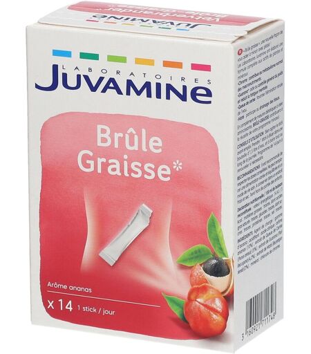 Complément alimentaire à utiliser dans le cadre d’une alimentation variée, équilibrée et d’un mode de vie sain.Brûle graisse une nouvelle façon de vous aider à mincir avec plaisir ! Composition:Agent de charge: maltodextrine, acidifiant: acide citrique, arome: extrait de queue de cerise - Prunus Cerasus: 5%, Extrait de graine de Guarana - Paulinia Cupana: 4%, Extrait de feuille de Maté - llexParaguariensis: 2%, édulcorants: acésulfame de potassium, sucralose, colorant: riboflavines, minéral: chlorure de chrome.Valeur nutritionelle: Pour 1 stick% AJR*Queue de Cerise600 mg Guarana500 mg Maté500 mg Chrome25 µg62,5 %*Apport journalier de référence Conseil d'utilisation:Bien agiter le stick avant emploi. Diluer 1 stick dans 1,5 L d'eau à boire tout au long de la journée. Programme de 14 jours à renouveler si nécessaire. Précautions d'emploi: Conserver dans un endroit sec et frais. Tenir hors de portée des jeunes enfants. Il est recommandé de respecter la dose indiquée. En complément de mesures diététiques à visée amincissante, Brûle-Graisse élimination contribuera à la réussite de votre programme minceur.Poids net: 14 sticksFabricant:Laboratoires Juva Santé8, rue Christophe Colomb75008 Paris ...