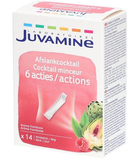 Complément alimentaire à utiliser dans le cadre d'une alimentation variée, équilibrée et d'un mode de vie sain.Juvamine Cocktail Minceur 6 Actions contient une formule optimale agissant à 6 niveaux :Le thé vert soutient la dégradation des lipides*.La queue de cerise est reconnue pour son action drainante sur l’organisme*.La queue de cerise facilite aussi l’élimination rénale de l’eau*.L’artichaut est reconnu pour ses propriétés dépuratives*.L’artichaut soulage les inconforts digestifs*.Cette formule contient également de la vitamine C qui contribue à réduire la fatigue.* Allégation de santé en attente d'approbation par l'EFSA.IngrédientsAgent de charge : maltodextrine ; acidifiant : acide citrique ; arôme grenade ; extrait de Framboise (fruit) Rubus idaeus (7,1 %) ; extrait de Thé vert (feuille) Camellia sinensis (6,3 %) ; extrait d’Artichaut (feuille) Cynara scolymus (6,3 %) ; colorant : rouge de betterave ; arôme framboise ; vitamine C ; extrait de Queue de cerise (tige) Prunus cerasus (1,7 %) ; édulcorant : acésulfame de potassium.Données nutritionnellesComposition pour 1 stickQuantité équivalent plante Artichaut (feuilles)5000 mgThé vert (feuilles)2000 mgQueue de cerise240 mgExtrait de framboises250 mgVitamine C soit 100 % des AR*80 mg* Apports de référence pour un adulte-type (8400 kJ/ 2000 kcal).Conseils d'utilisationsBien agiter le stick avant emploi. Prendre 1 stick par jour à diluer dans 1 litre d’eau (1 bouteille d’1L ou 2 bouteilles de 50 cl) et à boire tout au long de la journée. Programme de 14 jours, à renouveler si nécessaire.Précautions d'emploiConserver dans un endroit frais et sec.Tenir hors de portée des enfants.Ne pas dépasser la dose recommandée.Ne pas consommer si vous prenez d'autres produits contenant du thé vert le même jour.Ne convient pas aux femmes enceintes ou allaitantes ni aux enfants de moins de 18 ans.Ne pas prendre à jeun.Poids net14 sticksFabricantLABORATOIRES JUVAMINE8 rue Christophe Colomb75008 ParisFrance ...