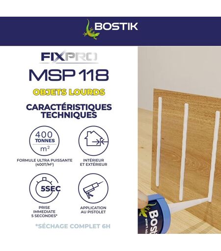 Bostik MEVRONISSHOP-FIXPRO ¿ Mastic Colle de Fixation MSP 118 ¿ Objets Lourds ¿ Intérieur/Extérieur ¿ Tous Supports ¿ Prise Immédiate en 5 secondes ¿ Mastic Hybride Polymère ¿ Couleur : Blanc ¿ 290 ml