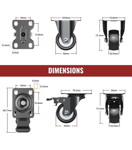 Mevronisshop-Roulettes Pivotantes De 50mm Roulettes Pour Meubles Avec Frein Pour Charges Lourdes Capacité Totale De 250kg Pour Un Set De 4 (2 Avec Frein Et 2 Roue Fixe)