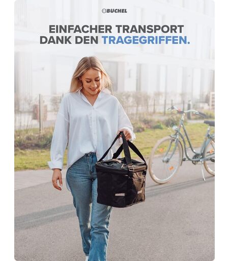 PLIABLE - Si vous n'avez pas besoin de votre panier amovible, vous pouvez le plier pour gagner de la place.SÉCURITÉ - Grâce à une bande réfléchissante 3M, le panier de vélo vous offre une visibilité accrue et donc plus de sécurité sur la route.CONVIENT POUR - tous les guidons d'un diamètre de 22 à 26 mm. Une fois le support monté, le panier peut être facilement fixé et retiré grâce au système de fixation express.DONNÉES TECHNIQUES - La charge utile du panier à vélo est de 5 kg maximum, ses dimensions sont d'environ 35 x 26 x 25 cm et son volume d'environ 20 l.PLUS DE 100 ANS D'EXPÉRIENCE - BÜCHEL est votre partenaire expérimenté dans le domaine du vélo. En tant qu'entreprise allemande avec plus de 100 ans d'expérience, nous vous proposons les meilleures solutions possibles pour votre vélo. ...