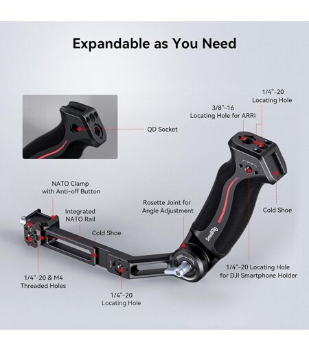 Pour DJI RS 4 / RS 4 Pro/ RS 4 Mini / RS 3 Mini / RS 3 / RS 3 Pro / RS 2 / RSC 2 : SmallRig Sling Handgrip 3028C est conçu pour réduire la fatigue du bras et ajouter de la stabilité aux prises de vue à faible angle. Il peut supporter jusqu'à 8 kg/17,6 lbs et adopte un support de bras plus long, ce qui le rend plus polyvalent pour RS 4 Pro et les configurations de caméra plus grandes.Conception Ergonomique Optimisée : Cette poignée à cardan a été mise à jour avec une conception incurvée qui s'adapte mieux à l'ergonomie. Sa longueur de préhension a été augmentée avec des arrêts pour les doigts, offrant une prise plus confortable et plus sûre pour les grandes mains. Construit avec un mélange de silicone et d'alliage d'aluminium, il est léger mais solide. Son design épuré et sa structure compacte s'accordent parfaitement avec le stabilisateur.Riche en Ports de Montage : La poignée a des trous filetés 1/4''-20, 3/8''-16 pour ARRI et cold shoe pour monter une large gamme d'accessoires, tels que le moniteur (fonctionne avec Monitor Mount 2905B), Lampe Vidéo (ID : 3286B), récepteur de son, transmission vidéo, rotules. Il peut répondre aux besoins de montage de plusieurs accessoires de photographie et de différents scénarios de prise de vue.Installation à Dégagement Rapide : Il se fixe solidement à votre cardan avec une pince NATO, avec un goujon anti-retrait pour un fonctionnement sûr et rapide. Sur cette version, nous intégrons un rail NATO sur le côté, permettant de monter SMALLRIG 3026B pour fournir un bon emplacement pour votre moniteur. De plus, une prise QD est ajoutée, offrant la possibilité de monter un cou ou une bandoulière QD pour un soutien supplémentaire.Réglage à 180 Degrés : La poignée à cardan SMALLRIG offre un réglage à 180° grâce à son joint de rosette intégré, vous donnant la flexibilité de tirer sous différents angles et réduisant la tension sur votre bras. Le joint de rosette peut être détaché, ce qui vous permet d'utiliser la poignée seule comme poignée de rosette. ...