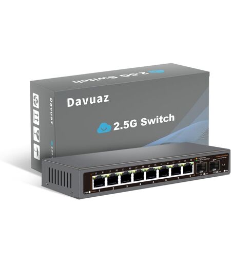 Commutateur Ethernet 2.5G : Comprenant 8* ports Base-T 2,5G et 2* ports Uplink SFP 10G, compatibles avec 100/1000/2500Mbps, le commutateur non géré est équipé d'une capacité de commutation de 25Gbps.Largement utilisé : Le voyant du port indique l'état du débit : le voyant ""L"" -- 2.5G ; le ""R"" -- 100/100Mbps, facile à fournir des performances optimales pour tous vos appareils, y compris WiFi 6 AP 2.5G, NAS 2.5G, adaptateur PCIe 2.5G, serveur 2.5G, PC de jeu, vidéo 4K, etc.Largement utilisé : Le voyant du port indique l'état du débit : le voyant ""L"" -- 2.5G ; le ""R"" -- 100/100Mbps, facile à fournir des performances optimales pour tous vos appareils, y compris 2.5G WiFi 6 AP, 2.5G NAS, 2.5G PCIe adapter, 2.5G server, gaming PC, 4K video, etc.Conception sans ventilateur : la conception sans ventilateur en métal réduit la consommation d'énergie, rendant le commutateur silencieux lorsqu'il fonctionne. Plug & Play : Facile à utiliser. Il suffit de brancher le cordon d'alimentation et de connecter le câble Ethernet directement à l'appareil sans autre configuration.Garantie sans souci : Nous nous efforçons de fournir à nos clients des produits de haute qualité et une satisfaction à 100 %. Veuillez nous contacter via en cas de problème. Vous obtiendrez une solution au problème, un remboursement sans tracas ou une réexpédition d'un nouvel article dans les 24 heures. ...