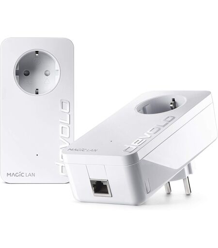 Internet magique de la prise de courant : le kit de démarrage Magic 1 LAN de devolo apporte un réseau haut de gamme dans votre maison, tout simplement sur le réseau électrique et partout où vous le souhaitez.La naviion et la diffusion en streaming à haute vitesse : le devolo Magic 1 LAN permet de surfer et de travailler confortablement et de diffuser des vidéos HD d'une vitesse pouvant atteindre 1200 Mb/s.Flexibilité inégalable: Grâce à la connexion Gigabit LAN, vous pouvez connecter plusieurs appareils comme Smart TV, console de jeux ou PC au réseau domestique.Une connexion Internet magique partout : Grâce à une portée incroyable de 400 mètres, l'adaptateur CPL vous permet de rester connecté à Internet même dans les endroits éloignés qui ne disposent pas de connexion réseau.Avec une nouvelle application devolo : l¿application intuitive préserve la vue d¿ensemble du réseau domestique et contrôle tous les adaptateurs connectés ¿ magiquement par smartphone. ...