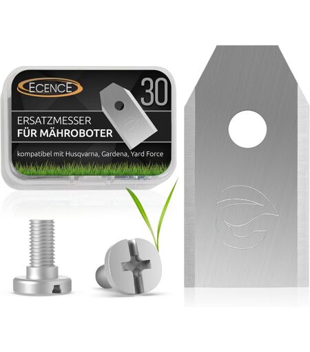 JEU DE LAMES DE RECHANGE: Vour recevrez un jeu complet de lames livrées avec les vis de fixation 30 - Nous recommandons de remplacer le kit de lames complet pour obtenir un résultat régulierGRANDE LONGEVITE: Les lames sont en acier inoxydable - Ce matériau confère une grande longévité et dureté des lames ainsi qu'une excellente protection contre la rouilleCOMPATIBLE AVEC: Husqvarna Automower 105 305 308 310 315 315X 320 330X 330ACX 420 430X 435X AWD 440 450X 520 535 AWD 550 G1 G2 G3 210C 220AC 230ACX 260ACX 265ACX SH Hybride solaire compatible avec Yardforce SC600Eco SA500Eco SA900 SA600 SA800Pro SA600H X100i X60i Amiro 400i Amiro 400 compatible avec Matrix Automowtic Mow 800 compatible avec Grizzly Mowing Robot MR 400 MR 1000ÉGALEMENT COMPATIBLE AVEC: Flymo 1200R compatible avec Gardena R38Li R40Li R45Li R50Li R70Li R75Li R80Li R100Li R100LiC R130Li R130LiC R160Li R165 R180 compatible avec Sileno Sileno life Sileno+ Sileno City smart Sileno City smart Sileno smart Sileno compatible avec McCulloch ROB R600 R1000 S600 S400 compatible avec BRAST BRA-RM-2400COUPURE NETTE: Notre lame de tondeuse a seulement 0,75 mm d'épaisseur et un poids plume de 3 g. Ces caractéristiques favorisent une coupure nette lisse et precise - Les vis sont inclues: vous trouverez également des vis adaptées à la fixation de lames sur votre tondeuse à gazon automatique inclues dans le paquetage. ...