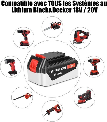 BATTERIE POUR BLACK & DECKER 18V: Type de batterie: Li-ion Tension: 18 V Capacité: 5,5 Ah Puissance: 99 W. 100% compatible avec les équipements et chargeurs d'origine du fabricantLARGE COMPATIBILITÉ: Cette batterie de remplacement lithium-ion est largement compatible avec Black + Decker tous les outils électriques 18V et chargeurs, remplacez la batterie pour LBXR20 LB20 LBX20 LBXR2020-OPE LBXR20B-2 LB2X4020 LB2X4020-OPE LST220.(Compatible avec Black & Decker le souffleur 18V bcbl200b-xj / la perceuse électrique 18V bdchd18k-qw / l'aspirateur sans fil 18V bdpse1815p-qw.) Remarque : non compatible avec les batteries NiMH 18 V HPB18SÉCURITÉ ET FIABILITÉ: Notre batterie de rechange pour Black et Decker 18V a été certifiée par des agences internationales professionnelles et dispose de plusieurs fonctions de protection intégrées pour éviter la surcharge, la décharge excessive, la surtension, la surintensité et la surchauffe, garantissant la sécurité des batteries et des outilsMATÉRIAUX DE HAUTE QUALITÉ: Batterie intégrée de haute qualité, L'utilisation de matériaux ABS+PC de haute qualité améliore la capacité de dissipation thermique de la batterie pour Black+Decker 18V, la rendant moins sujette à la déformation et bénéfique pour la durée de vie et la stabilité du produitSERVICE DE QUALITÉ: 30 jours sans soucis. Pour toute question sur nos produits, n'hésitez pas à nous contacter, nous répondrons à votre e-mail dans les 24 heures! ...