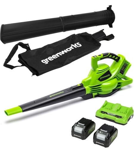 Greenworks SUBZONAL-2x24V Aspirateur Souffleur Sans fil de Feuilles à Batterie Bandoulière, Moteur Sans Balais, 322km/h, 9m³/min, Sac Mulching 45L, 2 Batteries 24V 4Ah, Chargeur, Garantie 3 Ans GD24X2BVK4X