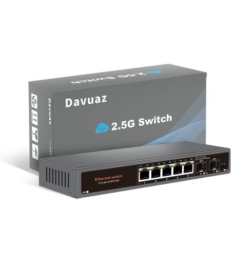 Commutateur Ethernet 2.5G : Comprenant 5* ports Base-T 2,5G et 2* ports Uplink SFP 10G, compatibles avec 100/1000/2500Mbps, le commutateur non géré est équipé d'une capacité de commutation de 25Gbps.Largement utilisé : Le voyant du port indique l'état du débit : le voyant ""L"" -- 2.5G ; le ""R"" -- 100/100Mbps, facile à fournir des performances optimales pour tous vos appareils, y compris WiFi 6 AP 2.5G, NAS 2.5G, adaptateur PCIe 2.5G, serveur 2.5G, PC de jeu, vidéo 4K, etc.Conception sans ventilateur : la conception sans ventilateur en métal réduit la consommation d'énergie, rendant le commutateur silencieux lorsqu'il fonctionne.Plug & Play : Facile à utiliser. Il suffit de brancher le cordon d'alimentation et de connecter le câble Ethernet directement à l'appareil sans autre configuration.Garantie sans souci : Nous nous efforçons de fournir à nos clients des produits de haute qualité et une satisfaction à 100 %. Veuillez nous contacter via en cas de problème. Vous obtiendrez une solution au problème, un remboursement sans tracas ou une réexpédition d'un nouvel article dans les 24 heures. ...