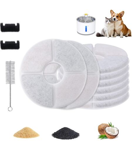 Filtre fontaine à eau pour chat ¿ Lot économique de 8 pièces Offrez à votre chat une eau fraîche pendant plusieurs mois, sans rupture de stock. Ce pack multiple garantit une eau saine à tout moment, tout en réduisant le coût par filtre.Filtre fontaine chat avec double filtration avancée Charbon actif et résine échangeuse d¿ions agissent ensemble pour éliminer les impuretés, neutraliser les odeurs et capturer les métaux lourds ¿ une combinaison efficace pour une eau pure et sans danger.Filtre fontaine a eau chat compatible avec les modèles populaires Parfaitement adapté à la majorité des fontaines 3L, y compris la célèbre Catit fontaine eau chat et les modèles ""Fontaine Fleur"". Idéal pour chats et petits chiens.Filtre fontaine chat à installation facile, sans outil requis Remplacez les filtres en quelques secondes ¿ aucun outil nécessaire. Assurez à votre animal une eau toujours propre et filtrée sans effort, même au quotidien.Fontaine chat : une eau propre favorise l¿hydratation Une eau filtrée, claire et sans goût désagréable incite votre chat ou chien à boire plus. Cela aide à prévenir les problèmes urinaires et à maintenir son bien-être général. ...