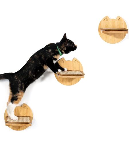 CONSTRUCTURE SÛREIl y a 2 vis pour relier le panneau vertical et le panneau horizontal avec le rembourrage anti-rayures. Et il y a 2 vis plus longues pour fixer l'ensemble au mur. Le matériau en bambou le rend porteur et stable sur le mur pendant qu'ils sont vissés ensemble. Sans danger pour tout chat actif.TAMPON À GRATTAGE INTÉGRÉ Une couche de grattoir en sisal est fixée sur la planche horizontale, ce qui permet de l'utiliser comme grattoir. Grattoir en fibre de jute naturelle qui permet d¿entretenir les griffes.Aide à éviter que votre chat n¿abîme moquette, mobilier, rideaux, etc. LE SET DE 3 ÉCHELLES INTERACTIVES POUR CHATS Il y a 3 planches verticales et 3 planches horizontales. Fixez-les au mur à des hauteurs et des angles différents pour permettre aux chats d'en profiter au maximum.FACILE À INSTALLER¿ COMBINABLESFixez d'abord les planches verticales et horizontales ensemble, puis fixez l'ensemble au mur. C'est aussi simple que cela.GAGNEZ DE L'ESPACE ¿ DE LA DÉCORATION Les chats aiment sauter en hauteur, nos marches aident les chats à grimper en hauteur, ou comme lieu de jeu et de détente.Gagnez de l'espace en laissant vos chats courir, sauter et grimper sur le mur plutôt que dans toute la maison. Utilisez nos étagères et perchoirs muraux pour chat comme décoration murale et des heures de plaisir pour vos animaux de compagnie ...