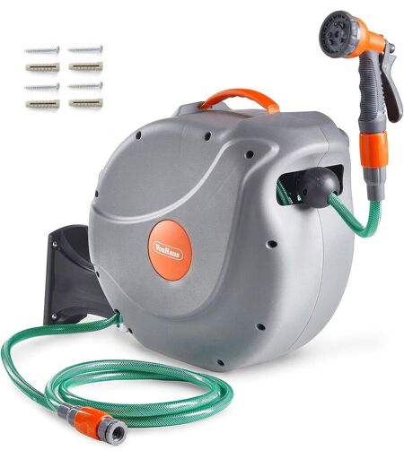ARROSEZ VOS PLANTES SELON VOS BESOINS : arrosez plus rapidement avec nos enrouleurs de tuyaux d'arrosage VonHaus, l'alternative simple votre arrosoir pour l¿arrosage de votre jardin.LONGUE PORTE : dot d'un tuyau enroulement automatique de 20 m pour une utilisation facile, ce dvidoir mural vous permet d'atteindre toutes les zones de votre jardin, mme trs loignes.VERROUILLAGE AUTOMATIQUE : pour utiliser votre tuyau d'arrosage avec enrouleur, tirez-le dlicatement la longueur souhaite et le mcanisme se verrouillera automatiquement. Le tuyau reste tendu pendant l'arrosage.ENROULEUR DE TUYAU MURAL AVEC PISTOLET D¿ARROSAGE : comprend un support mural pivotant 180 (fixations incluses) et un pistolet d¿arrosage 8 fonctions facile rgler pour diffrents types d'arrosage.LA PSSE VONHAUS : tous nos produits sont couverts par une garantie minimale de 2 ans, soyez donc sr(e) qu¿en cas de problme, nous serons l pour vous aider. Utilisez nos produits en toute confiance. ...