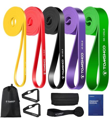5 niveaux de rsistance diffrents : le lot de bandes de traction TOMSHOO est livr avec 5 diffrentes tailles de rsistance de 208 cm de long et de 4,5 mm d'paisseur, chaque boucle est clairement marque entre 2,3 et 6,8 kg, 6,8 15,9 kg, 13,6 27,2 kg, 18,1 36,3 kg. L'ensemble fonctionnera au dbuter les tapes d'un exercice et jusqu' ce que vous soyez un pro.Durable et respectueux de la peau : la bande de rsistance Tomshoo est fabrique en latex naturel de la plus haute qualit et respectueux de l'environnement, extrmement durable, et difficile dformer. Elle est rsistante l'usure et conserve une bonne lasticit aprs une utilisation rpte. Le latex naturel est respectueux de l'environnement et sans danger pour la peau.Poignes uniques conues : avec deux poignes spares, les bandes de traction ne touchent pas les mousquetons, donc moins de dchirure et d'usure, et vous pouvez y mettre n'importe quel nombre de bandes si vous voulez plus de rsistance ; l'tui de protection amovible protge le bracelet contre les rayures, offre galement une prise en main plus confortable.Meilleure utilisation des bandes de rsistance : les bandes de traction avec des poignes uniques et un ancrage de porte vous aident vous tirer et entraner l'ensemble des groupes musculaires de votre corps : poitrine, taille, dos, membres, etc., parfait pour tous les types d'entranement, tels que les tractions dorsales, les ranges basses, les ranges verticales, les releves latrales, les triceps.Une salle de sport dans n'importe quel espace : la bande de rsistance est si compacte qu'elle ne prend pratiquement pas de place ou de poids, ce qui vous permet de profiter du fitness la maison, en plein air, en salle de sport, dans une salle de yoga, sur un terrain de sport et d'autres endroits. Livr avec un sac pour que vous puissiez ranger les bandes d'exercice proprement. ...