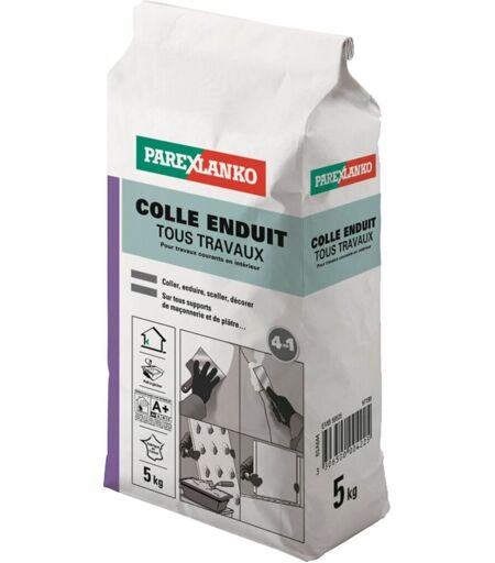 POUR REBOUCHER - Cette colle enduit pour travaux courants s¿utilise en tant qu¿enduit de rebouchage pour combler les trous, fissures et imperfections avant de raliser les travaux de finition.POUR COLLER - Cet enduit colle fortement adhrent est idal pour fixer durablement les revtements de murs isolants en polystyrne, en laine minrale ou en matriaux assimils.POUR LISSER - La Colle enduit Tous travaux Parexlanko s¿utilise galement comme enduit de lissage, pour prparer les murs intrieurs avant la pose d¿une peinture ou d¿un papier peint.POUR MONTER - Cette colle enduit tous travaux convient pour le montage des cloisons en carreaux de pltre. Elle permet aussi de recouvrir les joints entre les plaques de pltre bords amincis.MULTI-SUPPORT - Cette colle enduit est adapte pour une application sur de nombreux supports et matriaux : briques, parpaings, bton, bton cellulaire, pltre ou encore carreaux de pltre. ...