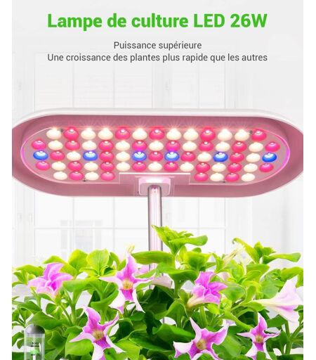 Lumire LED spectre complet Le potager intrieur hydroponique est quip d'une lumire LED spectre complet de 26W qui simule la lumire naturelle et favorise la photosynthse par tous les temps pour acclrer la croissance de vos plantes. Cela signifie galement que vous pouvez placer les plantes que vous souhaitez faire pousser n'importe o l'intrieur12 Emplacements de plantation Vous pouvez faire pousser jusqu' 12 plantes la fois. Plus vous en faites pousser, plus vous conomisez. Le kit comprend un total de 12 argiles spongieuses, 1 bouteille de granuls nutritifs solides et 12 longues perches pour grimper et fixer les plantes. Nous n'incluons pas les graines pour les plantes, vous devrez les acheter vous-mme4 Modes prrgls entirement automatiques et hauteur rglable Le jardin intrieur dispose de 4 modes prrgls avec diffrents ratios de lumire rouge et bleue et des temps d'clairage entre les diffrents modes, correspondant aux 4 diffrents stades de croissance des plantes. En outre, la hauteur de la lumire est rglable de 20 50 cm afin de s'adapter la hauteur des plantes en croissanceGrand rservoir d'eau de 3,5 L et systme de circulation automatique de l'eau Le kit de jardin hydroponique dispose d'un rservoir d'eau suffisamment grand et d'une pompe eau silencieuse pour fournir de l'oxygne aux racines des plantes. Il est dot d'un indicateur de niveau d'eau pour vous informer de la quantit d'eau restante dans le rservoir. Si le niveau d'eau tombe en dessous du minimum, la machine vous alerte pour le remplir nouveauDavantage de rglages personnalisables En plus des modes prdfinis, le jardin d'intrieur prend en charge davantage de rglages. Vous pouvez passer d'un clairage fort un clairage faible, rgler la dure du cycle d'clairage sur 8H/10H/12H et activer ou dsactiver la pompe. Un large ventail de rglages pour rpondre vos besoins ...