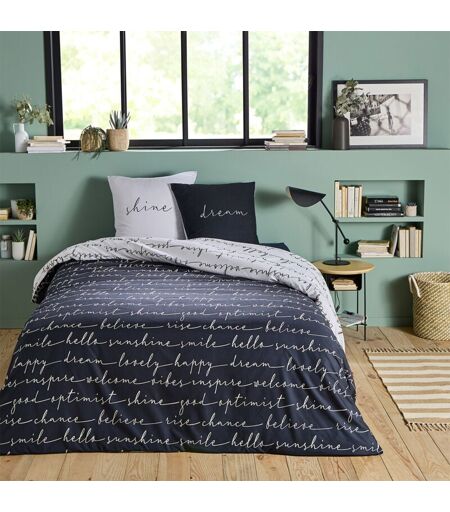 Parure de lit en microfibre réversible imprimé texte noir et blanc RITA comprenant 1 housse de couette + 2 taies d'oreiller 63x63cm. Avec notre parure de lit RITA en microfibre, nous avons opté pour un motif texte. Notre parure apporte un style sophistiqué et original à votre intérieur. N'attendez plus, et craquez vous aussi pour notre parure de lit RITA. Ce linge de lit imaginé par nos stylistes, est composé d'une housse de couette réversible finition boutons qui sauvera votre couette d'une évasion certaine. CARACTERISTIQUES PRODUIT : Matière : microfibre Couleurs : noir et blanc Certification : OEKO-TEX® Lavage : à 30°C en machine 2 taies d'oreiller 63x63cm La parure de lit RITA vous est envoyée dans un pochon en tissu réutilisable , aux motifs de la housse de couette, et transformable en tote-bag une fois que vos draps trôneront fièrement sur votre lit. En savoir plus : Ce produit labélisé STANDARD 100 by OEKO-TEX® - certificat n° 18.HPK48415 HOHENSTEIN HTTI suit un processus de ...