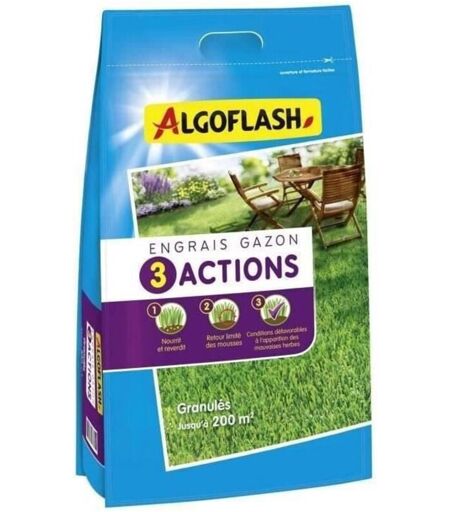 Engrais Gazon 3 Actions. Formulation mini-granulés. Fertilise le gazon, limite le retour des mousses, crée des conditions défavorables au développement des mauvaises herbes. Sans poussiere, sans odeur. ...