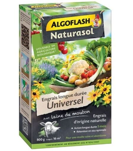 L'Engrais Universel Longue Durée Naturasol favorise la croissance des arbustes à fleurs, des légumes du potager et des arbres fruitiers, ce qui se traduit par une récolte abondante et de haute qualité. Fabriqué à partir de laine de mouton d'origine naturelle, cet engrais offre une action prolongée sur une durée de 5 mois, assurant ainsi une alimentation régulière et équilibrée pour vos plantes. Sa capacité de rétention en eau optimale garantit un arrosage efficace et réduit les besoins en maintenance. Il est utilisable en Agriculture Biologique, pour une récolte saine et abondante.Etui carton 800 g = jusqu'à 16 m² Utilisable : balcon, terrasse, jardin.De mars à octobre. Marque : ALGOFLASH Fournisseur : COMPO FRANCE DEEE : 0.0000 €Jardin et extérieurs Barbecues et accessoires feux Piscines Entretien de l'auto Matériel et outillage de jardin Mobilier et accessoires Insecticides et antinuisibles > Matériel et outillage de jardin Gants Plastiques Outillages divers Jardinage > Jardinage ...