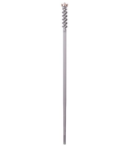 Foret PRO SDS max Break Through – Pour marteaux burineurs Conçu pour percer des trous traversants dans le béton Longue durée de vie lors du perçage de béton Le carbure de tungstene dur et de haute qualité assure résistance et durabilité Convient a tous les marteaux burineurs SDS max Longue durée de vie lors du perçage de béton 1Le carbure de tungstene dur et de haute qualité assure résistance et durabilité 2L'emmanchement a double hélice en U assure une évacuation efficace de la poussiere PRO SDS max Break Through pour une longue durée de vie lors du perçage dans le béton Percer de grands trous traversants dans du béton exige un foret approprié. Un foret doté d'une pointe suffisamment solide pour s'attaquer au matériau et d'un emmanchement qui évacue efficacement les petits débris de béton et la poussiere. Comme le foret PRO SDS max Break Through, conçu pour vous aider a percer de grands trous traversants, encore et encore. Le foret PRO SDS max Break Through perce le matériau avec sa tete a 3 taillants. Nous l'avons fabriqué a partir de carbure de haute qualité brasé sous vide et durci pour plus de résistance et de performances durables. Sa forme en U, ses deux hélices et son emmanchement conique empechent la poussiere et les petits débris de béton de l'obstruer. Utilisez-le pour percer des trous entre 45 et 80 mm de diametre.> ...