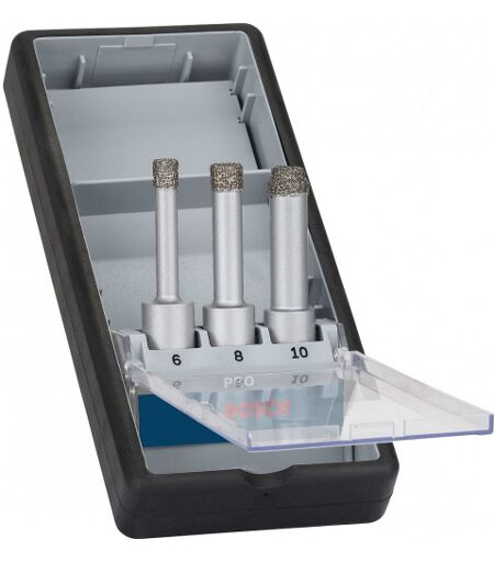 Coffret de forets PRO Ceramic dry – Pour perceuses/visseuses rotatives Conçu pour percer les carreaux de céramique durs et tendres Longue durée de vie lors du perçage dans les carreaux de céramique durs et tendres Concrétion et matrice diamant de haute qualité pour la durabilité et la précision Longue durée de vie lors du perçage dans les carreaux de céramique durs et tendres 1Concrétion et matrice diamant de haute qualité pour la durabilité et la précision PRO Ceramic dry pour une longue durée de vie lors du perçage dans les carreaux de céramique durs et tendres Vous voulez percer des trous nets dans les carreaux de céramique durs et tendres sans avoir besoin de configurations compliquées avec du lubrifiant ? Alors le foret PRO Ceramic dry est fait pour vous : il associe un perçage efficace et une excellente durabilité. La qualité et la durabilité du foret a sec PRO Ceramic dry reposent sur son grain diamanté de haute qualité.> ...