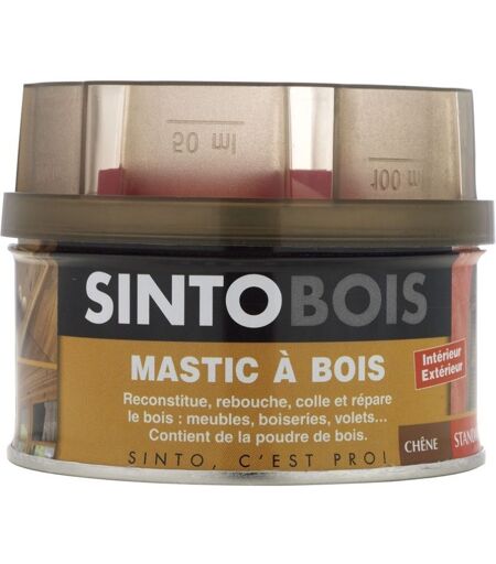 Sintobois mastic à bois avec durcisseur Sinto - Boîte 170 ml / 190 g - Chêne Mastic bi-composant pour préparer, restaurer, reconstituer une partie du bois manquante, boucher, coller le bois et ses dérivés Grande facilité d'application Bonne résistance mécanique Excellente adhérence sur le bois Application en interieur et extérieur Prise rapide Marque : Sinto Référence fournisseur : 139700 Gamme : Sintobois Type de produit : Mastic bois avec durcisseur Couleur : Chêne Utilisation : Bois Environnement d'utilisation : Intérieur et extérieur Emission dans l'air intérieur : A Poids : 190 g Contenance : Boîte 170 ml Conseils d'utilisation : Utiliser des gants de protection appropriés résistants aux agents chimiques conformes à la norme NF EN 374. Porter des lunettes de sécurité à écrans latéraux ou des lunettes étanches. Les protections oculaires doivent être conformes à la norme EN 166. En cas de fortes projections, porter des vêtements de protection chimique étanches aux liquides (type 3) conformes à la norme NF EN14605 pour éviter tout contact avec la peau. En cas de risque d'éclaboussures, porter des vêtements de protection chimique (type 6) conformes à la norme NF EN13034 pour éviter tout contact avec la peau. Avertissement : Tenir hors de portée des enfants, Dangereux. Respecter les précautions d'emploi Composition : STYRENEOXYDE DE SILICIUM Equipement de protection requis : Protection des yeux - Lunettes de protections, Protection des voies respiratoire - Masque filtrant à cartouche, Protection des mains - Gants de protection, Protection du corps - Vêtement de protection ...