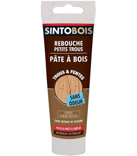 Idéale pour reboucher les petits trous dans le bois Pour trous et fissures jusqu'à 3mm maxi Existe en plusieurs teintes : Chêne foncé, Chêne clair, Merisier, Acajou, Pin, Blanc, Naturel Séchage en 4h Sans odeur Ne se rétracte pas Intérieur et extérieur Existe aussi en 250g Rebouche les imperfections et fissures dans le bois La pâte à bois "Rebouche imperfections" Sintobois répare les fissures et trous de vers ou de clous sur les mobiliers en bois, les portes, les fenêtres, les escaliers ... que ce soit à l'intérieur ou à l'extérieur. Pour les trous ou les fissures plus larges, consultez notre guide pour vous aider dans le choix du bon produit. Facile et prêt à l'emploi Sans odeur, la pâte à bois "Rebouche imperfections" Sintobois se travaille en 30 minutes avant le début du durcissement. Il sèche en 4h, sans se retracter. Attendre 2h si vous choisissez d'appliquer une deuxième couche. Une fois sec, la pâte à bois "Rebouche imperfections" Sintobois se ponce, se perce, se visse ... Toutes finitions La pâte à bois "Rebouche imperfections" Sintobois existe en plusieurs teintes : Chêne moyen, Chêne foncé, Chêne clair, Merisier, Acajou, Pin, Blanc, Naturel. Il accepte toutes finitions : vernis, peinture, lasure ... (obligatoire pour un usage extérieur). Comment utiliser le Rebouche bois pour imperfections et fissures Sinto ? Homogénéiser la pâte. 1ère étape : Nettoyer le supportPoncer, dépoussiérer et aspirer les résidus. 2ème étape : Appliquer, boucherAppliquer en couche épaisse, lisser avec la spatule et laisser sécher. 3ème étape : PoncerAprès séchage, poncer au grain fin, puis dépoussiérer. ...