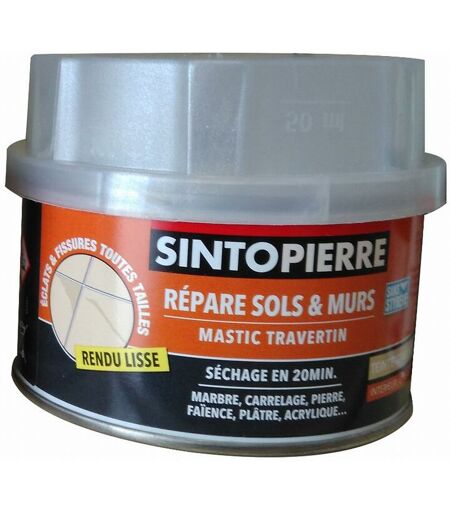 Description générale Le mastic de réparation SintoPierre est un produit bi-composant idéal pour la restauration, le collage, et le colmatage de divers types de pierres naturelles et reconstituées, y compris le marbre, le granite, et la terre cuite. Il est conçu pour offrir une excellente adhérence et est facile à appliquer, rendant vos réparations simples et efficaces. Spécifications techniques Aspect : Pâteux Teinte : Travertin Type de liant : Polyester Durcisseur : Péroxyde de dibenzoyle Densité : 1,65-1,69 Point éclair : 31°C Temps de travail : 4 minutes à 20°C avec 2% de durcisseur Temps de séchage : 15 minutes à 20°C avec 2% de durcisseur Ponçable et recouvrable : 15 à 20 minutes à 20°C Grain conseillé pour ponçage : P80 à sec Température d’application : 10 à 30°C Conservation : 12 mois dans son emballage d'origine, à l'abri de la chaleur et de la lumière directe du soleil. Compatibilité et accessoires Compatible avec le marbre, granite, ardoise, ciment, et pierre reconstituée. ...