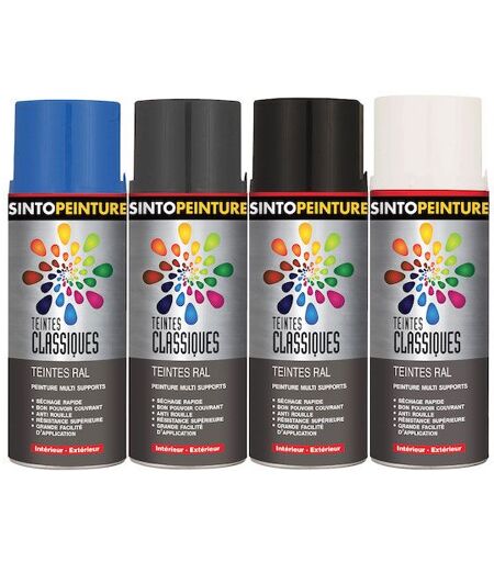 peinture teintes ral classiques sinto antirouille Cette peinture teintes RAL classiques de la marque Sinto est une peinture acrylique spécifique pour la décoration qui donne une couverture brillante, opaque et antirouille. Les teintes classiques SintoPeinture sont des teintes dites ''RAL'' qui déterminent une couleur précise connue dans l'univers de la peinture et surtout par tous les professionnels. Peinture synthétique à séchage très rapide, pour une application intérieure et extérieure qui adhère sur tous les types de supports. Elastique, résistante, elle offre une bonne couverture et différentes finitions mat, brillant, satiné. Caractéristiques techniques : Aérosol 400 ml Rendement moyen : 1 m² pour un aérosol de 400 ml Conservation : 24 mois dans son emballage d'origine bien fermé dans un endroit frais (< 25 °C), à l'abri de la chaleur et du rayonnement solaire ...