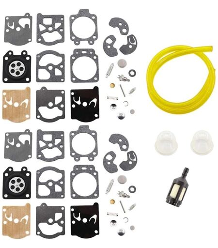 Numéro de pièce de rechange : K10-WAT. Modèle Compatible: remplacer Walbro K10-WAT Convient aux applications suivantes : le modèle suivant Walbro carburateurs : Echo CS 302, HC 210, PB 210 E, PB400, SRM 4600, 4605 Husqvarna50R, 26L, 232R, 235R, 225R, 240 Partenaire 330, P500 Poulan 1800, 200, 2300, Pro 205, 185, 235, S 25 D, S25DA, MicroXXV 2050, 2150, 2450, 505, 2500, 2900, 050, Pro 111 Ryobi720R Shindaiwa 305, 345, 405, 415, 450, 500, 575, F20, XE 405 AT, E 305AV Stihl 09, 010, 011, 028, FS40, FS44, FS85, FS 586, FS 88, FS 106, FS 180 Compatible avec les carburateurs Walbro séries WA et WT. Contenu de l'emballage : 2 kits de réparation + 2 ampoules d'amorçage + 1 filtre à carburant + 1 tuyau de carburant Description du produit Compatible avec les carburateurs Walbro WA et WT. Tronçonneuse Echo modèle : 3100 401 EVL 452 VL CS281 CS281 EVL CS302S CS302S CS304 CS315 VL CS320T CS340T CS340T Carburateur CS3050 CS3100 CS3400 Gaz T-40 2-1) CS3450 (avec carburateur WT-261-1) CS3600. ECHO ...