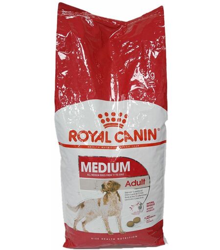 À 12 mois, votre chien de taille moyenne est devenu adulte, en termes de croissance physique. À ce stade de sa vie, une bonne alimentation est tout aussi importante qu’elle ne l’était pendant sa croissance. S’assurer que l’alimentation de votre chien lui fournit les bons nutriments est essentiel pour préserver et renforcer sa santé.ROYAL CANIN® Medium Adult est spécialement formulé pour répondre aux besoins nutritionnels de votre chien adulte de taille moyenne et convient aux chiens âgés de 1 à 7 ans pesant entre 11 et 25 kg.ROYAL CANIN® Medium Adult contient un complexe exclusif d’antioxydants et de nutriments qui contribuent au renforcement des défenses naturelles de votre chien et lui permettent de conserver un mode de vie sain.Grâce à une formule exclusive contenant des protéines de très haute qualité, ROYAL CANIN® Medium Adult favorise également une digestibilité optimale, ce qui permet à votre chien d’absorber efficacement les nutriments. De plus, l’apport équilibré en fibres alimentaires améliore encore la digestibilité pour votre chien.ROYAL CANIN® Medium Adult est également enrichi en acides gras oméga-3 (EPA et DHA) pour préserver la bonne santé de la peau et du pelage de votre chien.Indication:Aliment complet pour chiens adultes de races moyennes (de 11 à 25 kg) - De 12 mois à 7 ans.Bénéfices:Défenses naturellesAide à soutenir les défenses naturelles de votre chien, notamment grâce à un complexe d’antioxydants et aux manno-oligo-saccharides.Haute digestibilitéFavorise une digestibilité optimale grâce à une formule exclusive comprenant des protéines de très haute qualité et un apport équilibré en fibres alimentaires.Omega 3 : EPA-DHAEnrichi avec des acides gras oméga 3 (EPA-DHA) pour aider à maintenir la santé de la peau.Recommandations concernant l'alimentation:Quantités journalières recommandées :Poids du chienVie à l’intérieur - pas d’exercice-Activité normale-Chiens très actifs--GrammeDoseGrammeDoseGrammeDose11 kg149 g1+4/8173 g1+6/8196 g212 kg159 g1+5/8185 g1+7/8210 g2+2/814 kg179 g1+7/8207 g2+1/8235 g2+4/816 kg198 g2+1/8229 g2+3/8260 g2+6/818 kg216 g2+2/8250 g2+5/8284 g320 kg234 g2+4/8271 g2+7/8308 g3+2/822 kg251 g2+5/8291 g3330 g3+4/824 kg268 g2+6/8310 g3+2/8353 g3+5/825 kg276 g2+7/8320 g3+3/8364 g3+6/8À conserver dans un endroit sec et frais.Composition:Protéines de volaille déshydratées, farine de maïs, maïs, farine de blé, graisses animales, protéines de porc déshydratées, blé, hydrolysat de protéines animales, pulpe de betterave, huile de poisson, sels minéraux, huile de soja, levures et composants de levures, hydrolysat de levure (source de manno-oligo-saccharides (0,05 %)).Additifs (au kg):Additifs nutritionnels : Vitamine A : 12500 UI, Vitamine D3 : 800 UI, E1 (Fer) : 43 mg, E2 (Iode) : 4,3 mg, E4 (Cuivre) : 13 mg, E5 (Manganèse) : 55 mg, E6 (Zinc) : 133 mg, E8 (Sélénium) : 0,11 mg - Conservateurs - Antioxygènes.Constituants analytiques:Protéine : 25,0 % - Teneur en matières grasses : 14,0 % - Cendres brutes : 6,1 % -... ...