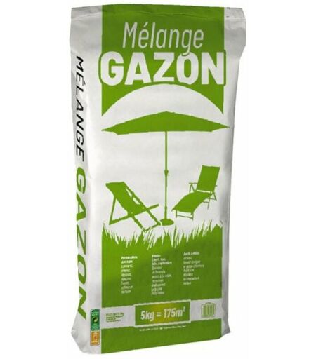 Sac de 5 kg Levée très rapide Résistant au piétinement Densifie les pelouses clairsemées Ravive le jardin Composition: Ray grass anglais ETERLOU: 30 % Ray grass anglais TRANSAT: 25 % Engrais: 45 % Couvre environ 175 m² de surface ...