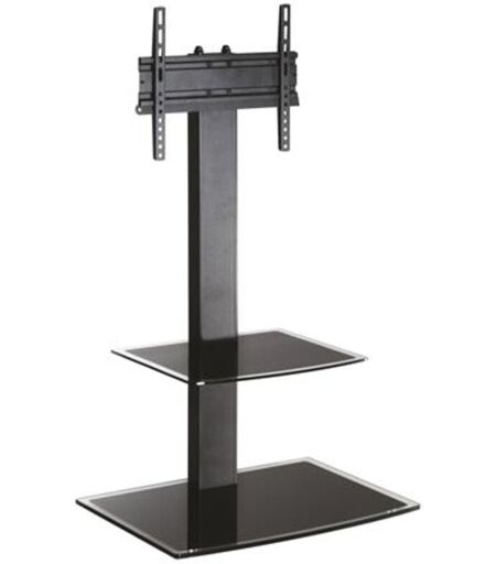 STUDIO 600 - Compatible VESA 75 jusqu'à 300 - Colonne fixe pour téléviseur de 19 à 32 pouces (25 kg maxi) avec étagère porte périphérique en verre trempé sérigraphié de 6 mm (10 kg maxi) - La tête de la colonne (en métal) est fixe et son socle, en verre trempé, posé sur des patins en métal - Peinture époxy noire grainée. ...