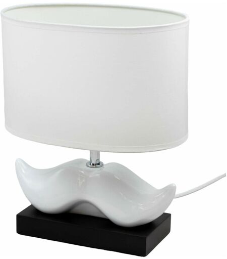 Petite lampe à poser pied en forme de moustache et abat-jour ovale tissu blanc Compatible ampoules LED (Ampoule basse consommation fournie) Descriptif : Couleur : blanc et noir Matériau : Pied en céramique, Abat-jour en tissu Usages spécifiques : Usage intérieur uniquement Diamètre abat-jour : 24 cm Hauteur Abat-jour : 15 cm Hauteur totale (socle et abat-jour) : 29 cm Caractéristiques techniques : Type d'ampoule compatible : LED, Halogène, Fluo compacte Type de culot : E14 Puissance : 40 Watts Ampoule incluse : Oui Volt : 230 Branchement : prise secteur Type d'interrupteur : Bouton bascule Osez l?originalité avec cette petite lampe à poser au pied en forme de moustache. D'une hauteur total de 29 cm, cette petite lampe à poser conviendra à la décoration de votre salon ou de votre chambre comme lampe de chevet. L'utilisation d'un luminaire adapté aux ampoules LED vous permettra de réaliser des économies d'énergie ...