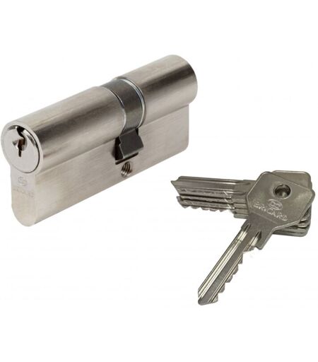 5 clés. Cylindre débrayable : ouvertures simultanées. Cylindre 5 pistons. Bonne résistance à l'usure et à la corrosion. Protections contre le crochetage. 5 clés. Taille du cylindre (extérieur et intérieur) (en mm): 30 + 40 Destination: Pour porte d'entrée donnant directement sur la rue Niveau de sécurité (en indice): 2 Nombre de goupilles: 10 Longueur du cylindre (en mm): 30+40 Fonction confort: Débrayable Type de cylindre: 2 entrées de clé Matière du cylindre: Laiton nickelé Résistance accrue à la corrosion: Oui Conseil d'entretien: Pour la pose: une fois le cylindre installé, vérifier le bon fonctionnemment du mécanisme avant de fermer la porte. Pour l'entretien: utiliser régulièrement du graphite pour éviter le grippage de votre cylindre. Ne jamais utiliser d'huile ou de corps gras Nombre de clés: 5 Mode de reproduction de la clé: Les clés peuvent être reproduites sans justificatif à l'aide de la clé d'origine Antiperçage: Non Anticrochetage: Oui Anticasse: Non Système antibumping: ...
