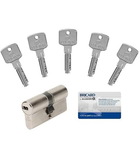 Cylindre 6 goupilles dimensions 30+30 débrayable nickelé Bricard + 5 clés réversibles Code livraison : SSLW Caractéristiques et avantages Ne perdez plus vos clés ! Service Securkeys (Trophée de l'assurance 2018) offert pendant 1 an : garde et livraison anonymes de votre double de clés, en 1h partout en France, 24h/24 et 7j/7. Résistance au crochetage, au perçage, à la casse et à l'arrachement Cylindre débrayable : possibilité d'ouvrir la porte de l'extérieur, même si une clé est déjà introduite côté intérieur. Garantie 10 ans ...