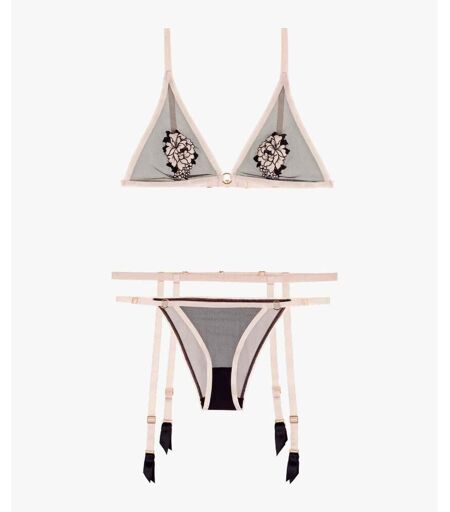3Suisses : BRODERIE: 100% Polyester FOND: 100% Coton TULLE: 80% Polyamide 20% Elasthanne PRESENTATION Cet Ensemble 3 pièces - Soutien-gorge triangle - Slip mini-coeur - Porte-jarretelles ? Rose de la marque Aubade vous transforme en une tentatrice envoûtante. Chaque pièce de lingerie se compose d?un tulle stretch pour une belle sensation de douceur. Son soutien-gorge triangle sans armatures dessine un séduisant décolleté naturel. La broderie florale apporte opacité et romantisme à toute la pièce. Le slip mini-c?ur dévoile subtilement la féminité et la beauté des hanches avec ses côtés étroits. Enfin, le porte jarretelle joue la carte du minimalisme avec ses bandes élastiques qui créent un effet cage très sexy. Très suggestif, pimentez vos moments à ceux en vous parant de cet Ensemble 3 pièces de la collection Boîte à désir. ENTRETIENLavage main à l'eau tiède recommandé ou programme délicat en machine (30° max), dans un filet de protection. CONSEIL TAILLEPrenez votre taille habituelle Marque: Aubade ...