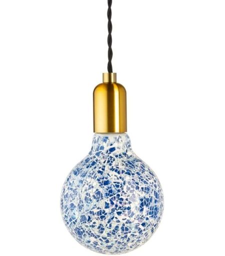 Les caractéristiques techniques Cette Ampoule décorative Led à filament dimmable E27 se présente sous la forme d'un globe agrémenté d'une mosaïque bleue . Elle est dimmable ce qui vous permet de choisir l'intensité lumineuse souhaitée . A l'intérieur du globe se trouve une ampoule T20 E14 changeable. Une installation simple : douille E27 Les avantages esthétiques Le concept des ampoules décoratives correspond pleinement à la philosophie que Girard Sudron a de son métier : ""la lumière Girard Sudron, elle se montre, elle se voit, elle se vit !"" Elle est en verre et diffuse une agréable lumière avec des effets lumineux . Cette ampoule mosaïque s’intégrera parfaitement dans une décoration contemporaine, sur un pied de lampe années 70 mais vous permet également de donner libre cours à votre fantaisie pour créer une ambiance amusante dans votre pièce à vivre ou une chambre d'adolescent. Elle convient parfaitement pour une lampe d'appoint dans votre pièce à vivre ou pour créer une ambiance ...
