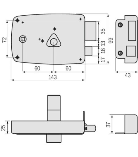 Coffre de 143 x 99 mm. Axe de clé : 60 mm. Axe du fouillot : 120 mm. Fouillot carré de 6 mm. ...