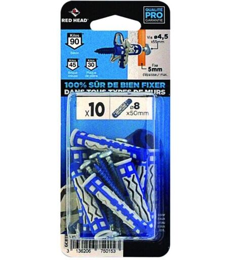 Red Head - Lot de 10 chevilles et vis couleur Diam.8 mm x L.50 mm