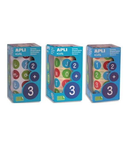 Boîte de 3 rouleaux de gommettes Apli Kids lettres majuscules ABC + chiffres - 123 unités - 20 mm - couleurs assorties