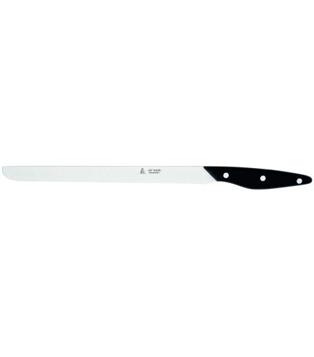 Ce couteau à saumon Au Nain Brasserie dans votre cuisine Lame 27cm souple en acier inoxydable Z40C13 de qualité Manche ergonomique noir en polyacétane + 3 rivets de maintien Fabriqué en France ...