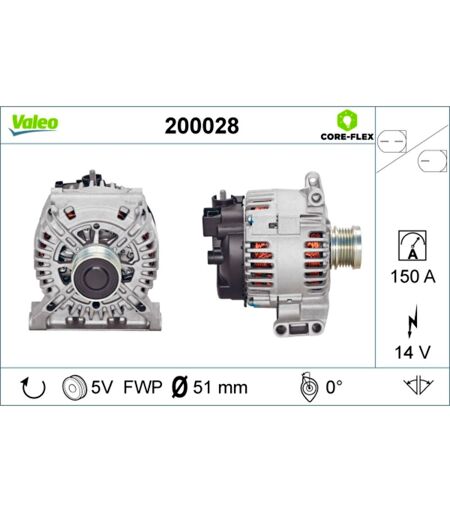 Article complémentaire/info complémentaire: avec régulateur intégré. Courant de charge de l'alternateur (a): 150. Fabricant: VALEO. Index: VAL200028. Nombre de stries: 5. Numéro du fabricant: 200028. Poids [kg]: 7,08. Poulie pour courroies - ø [mm]: 51. Poulies: avec poulie débrayable. Sens de rotation: Rotation dans le sens des aiguilles d'une montre. Voltage [v]: 14. ...