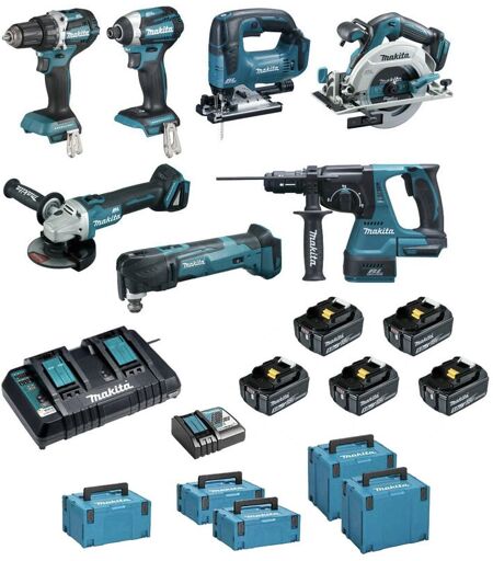 Makita - Pack de 7 machines 18V DLX7014PTJ (DDF484+DTD154 +DGA506+DHR243 +DTM51+DJV182 +DHS680 + 5x5,0Ah + DC18RD + 2xMAKPAC 2 +makpac 3 + 2xMAKPAC 4)