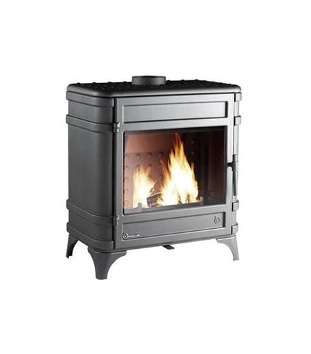 Poêle à bois vintage de couleur noir, rendement de 77%, puissance de 12 kW ...