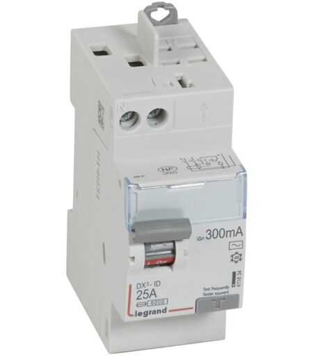 Interrupteur différentiel DX³-ID arrivée vis et départ automatique 2 Pôles 230V 25A type ac 300mA 2 modules Legrand 411634